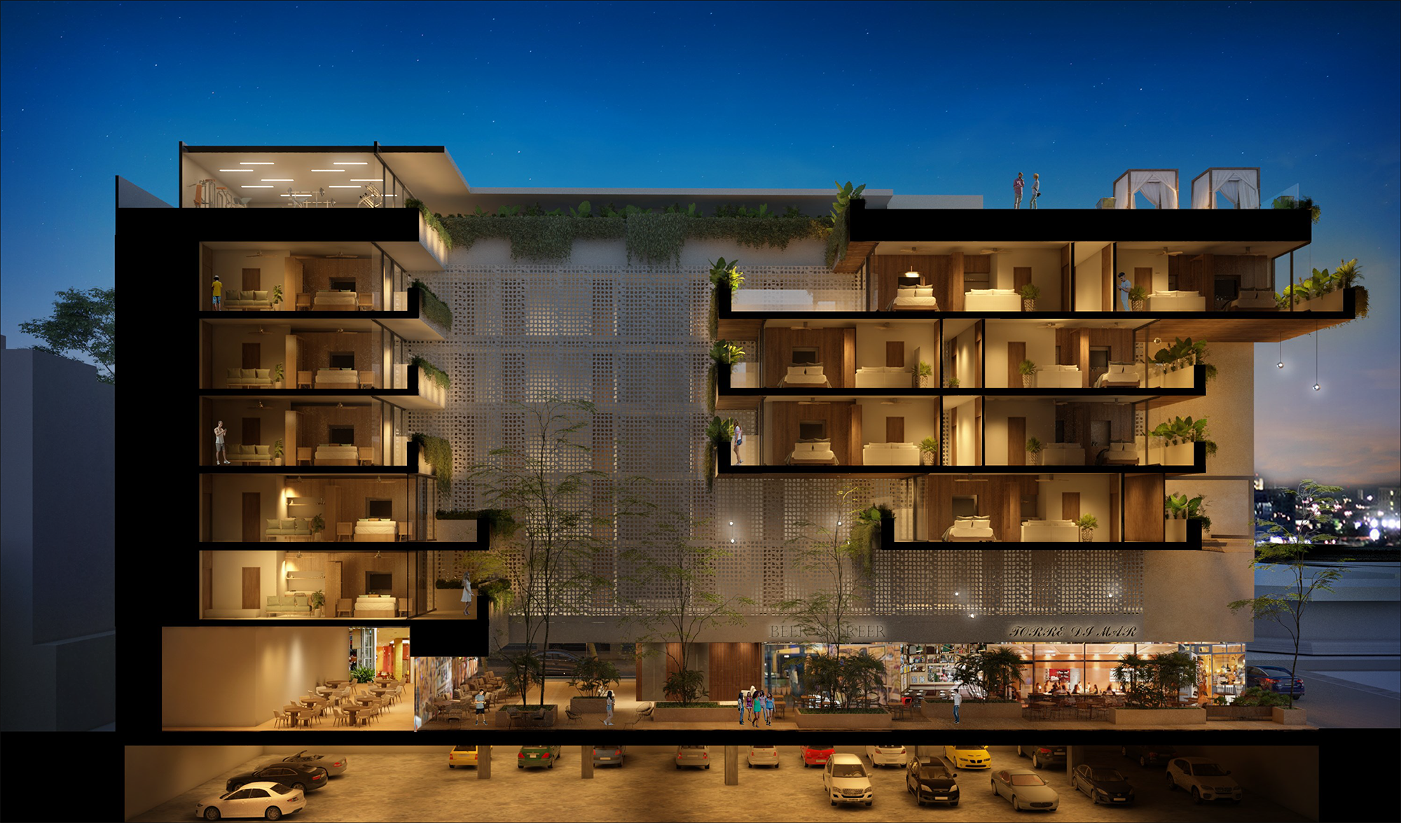 Contamos con 114 unidades tipo studio que van de los 30 a los 40m2, distribuidos en 6 niveles y con zona comercial para restaurantes.